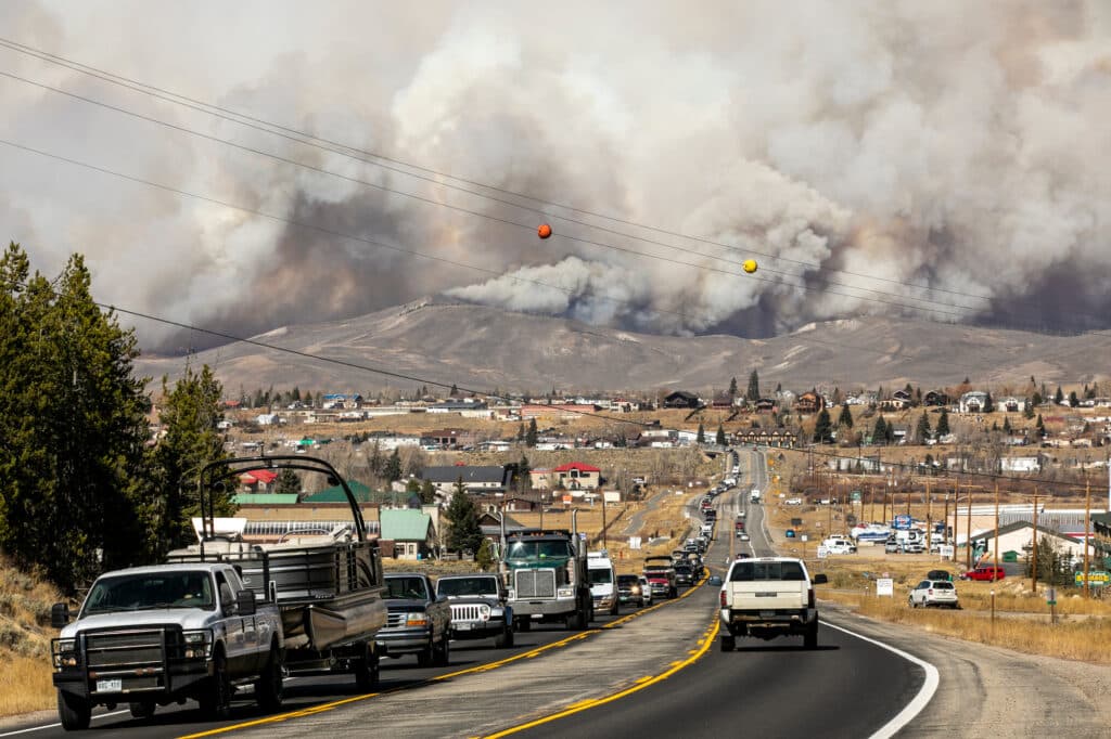 Hart Van Denburg/CPR NewsWith the East Troublesome fire blowing close to Granby, officials posted a pre-evacuation notice Thursday afternoon, Oct. 22, 2020. Motorists joined a long slow procession out of town on Hwy. 40 south.