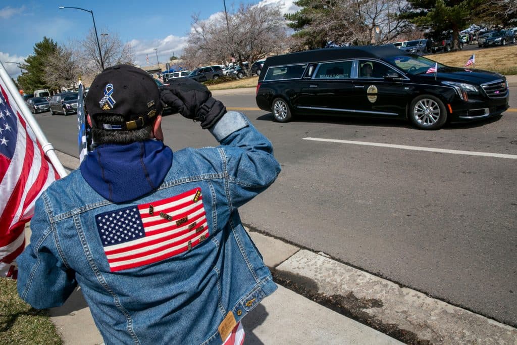 Hart Van Denburg/CPR NewsJoe Duran of Thornton,,salutes as a hearse carrying the casket of Officer Eric Talley leaves Foothills Community Church.