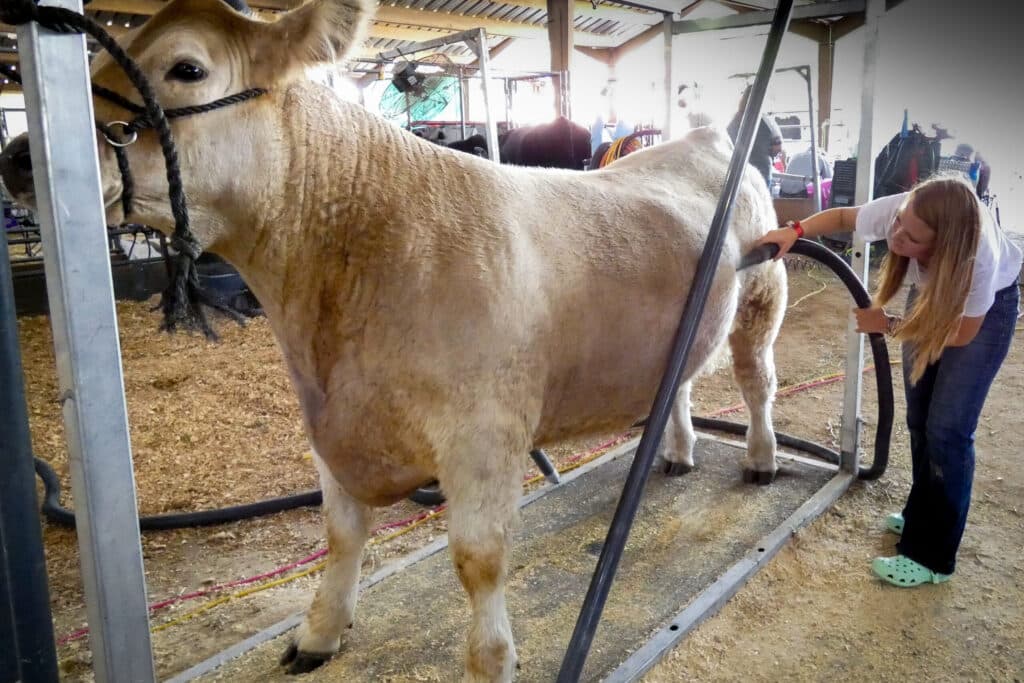 Ashlyn Rockey of Center uses a blow drier to get her steer ready for the livestock show at the 2021 Colorado State Fair in Pueblo.