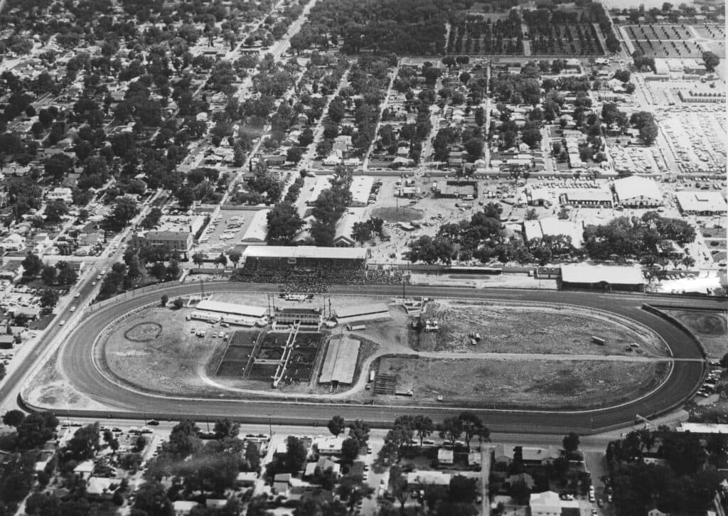 An undated aerial photo of the Colorado State Fair grounds in it's current location, showing the long gone racetrack.
