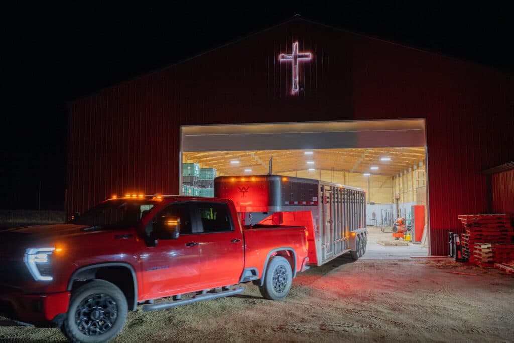 Hart Van Denburg/CPR NewsWith the cattle loaded, and the rest of the family on board, Nate Weathers drives the truck and trailer out of the barn at about 4:45 am. on Thursday, Jan. 23. The family has about a three-hour drive to Denver from Yuma County. They’ll stop for gas and breakfast burritos in Keenesburg.