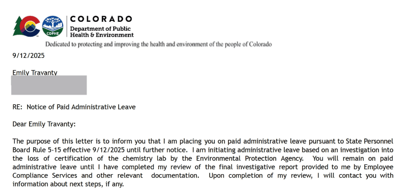 The executive director of the Colorado Department of Public Health and Environment, Jill Hunsaker Ryan, wrote to Travanty on Sept. 12: “I am initiating administrative leave based on an investigation into the loss of certification of the chemistry lab by the Environmental Protection Agency.”