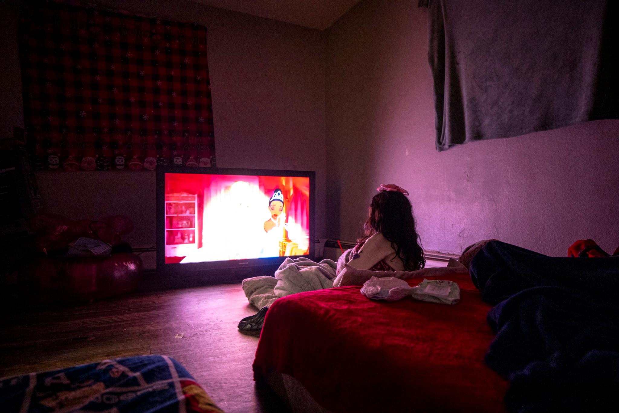 Jocelyn's daughter watches a dubbed Disney movie in their Aurora apartment, in the early hours of Feb. 5, 2025.