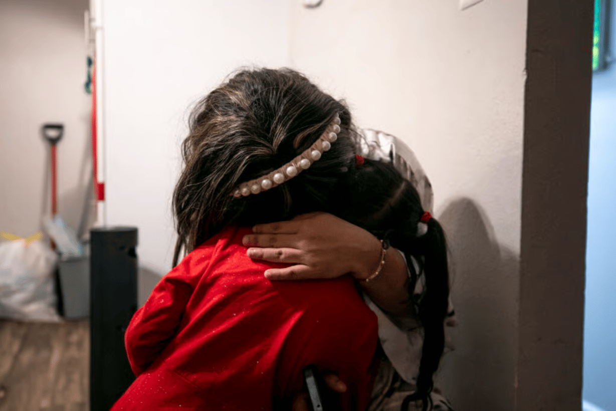 Daniela, an immigrant from Venezuela, embraces her daughter in their apartment in Aurora's Edge at Lowry complex. (Kevin J. Beaty/Denverite)