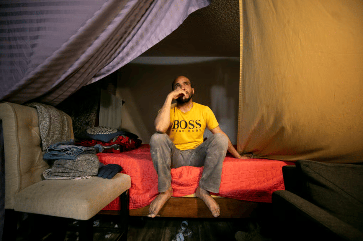 Charles, an immigrant from Venezuela, sits on his bed in Aurora's Edge at Lowry apartments, tearing up as he talks about his wife and young daughter, who've been stuck in Mexico for two months. (Kevin J. Beaty/Denverite)