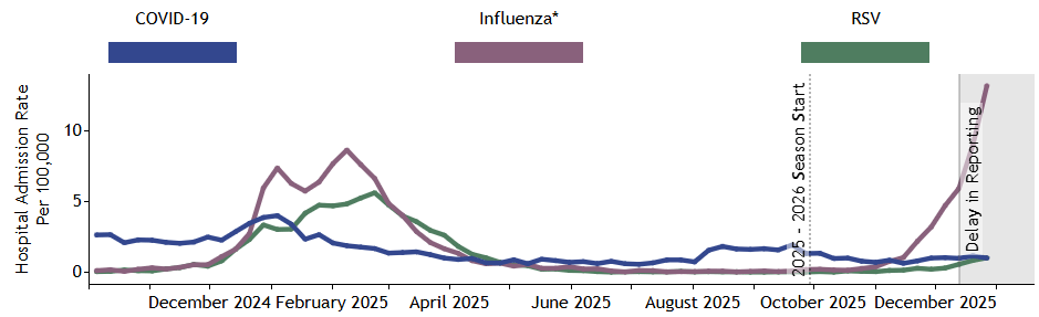 The ominous trend is reminiscent of the worst surges of the pandemic, with a variety of metrics on the state’s viral respiratory diseases dashboard all blinking red. This time, however, it’s not COVID-19, but flu, which is also now circulating widely in the U.S.