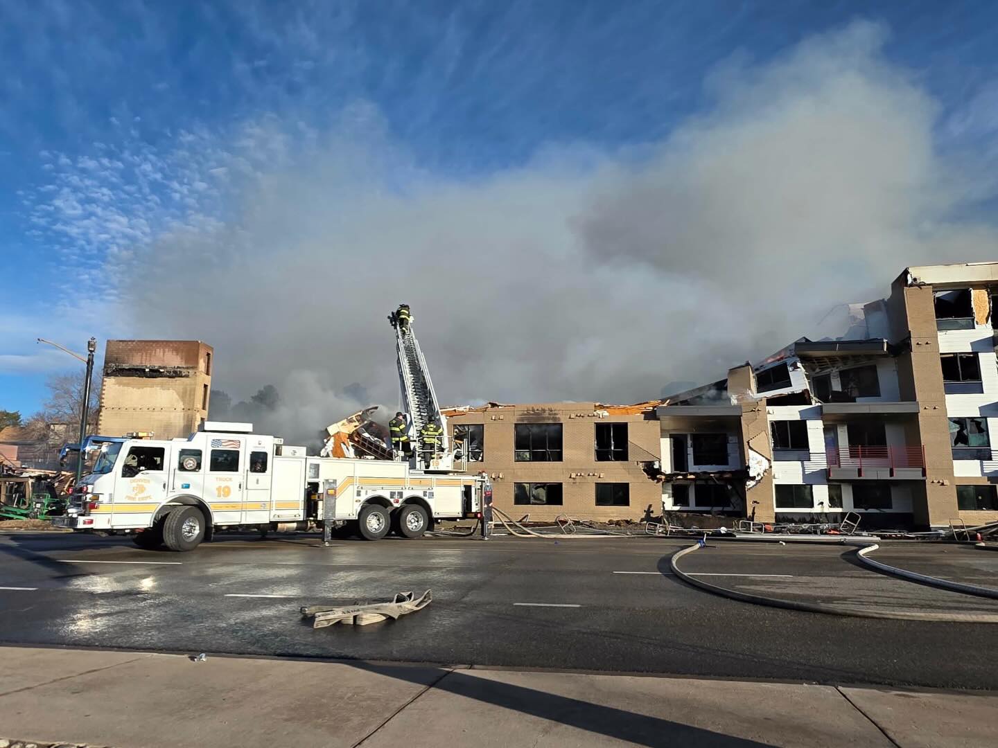 Fire control efforts continued through Saturday at the smoldering site of a partially complete apartment complex in southeast Denver.