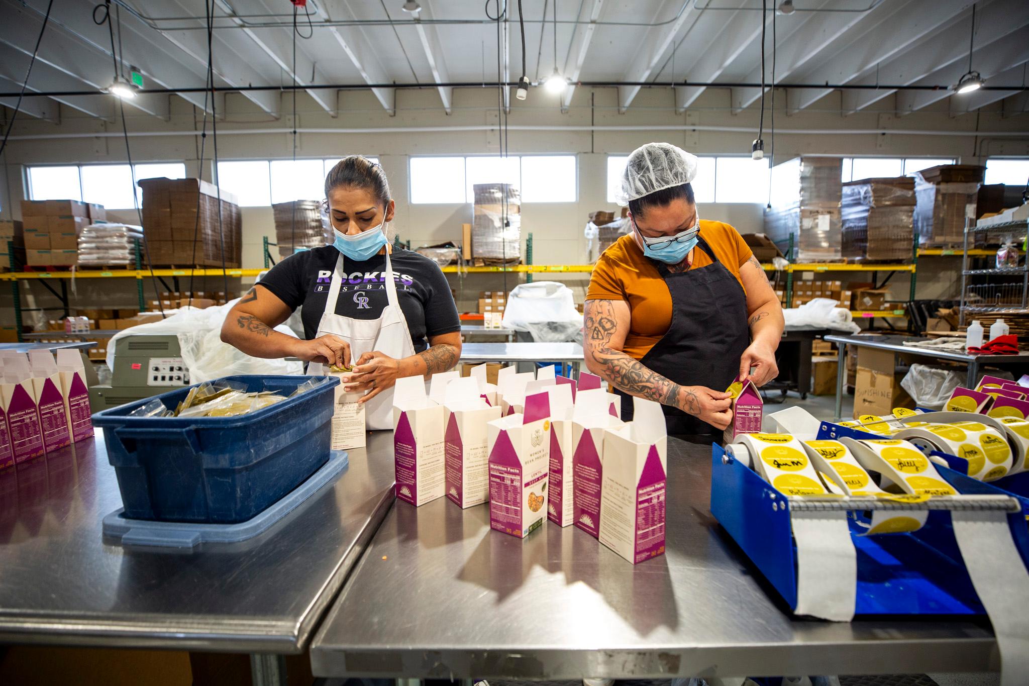 Amanda Menchaca (left) and Thomasene Flammond pack boxes of lentils at the Women's Bean Project's production facility in Denver's Athmar Park neighborhood. Dec. 23, 2025.