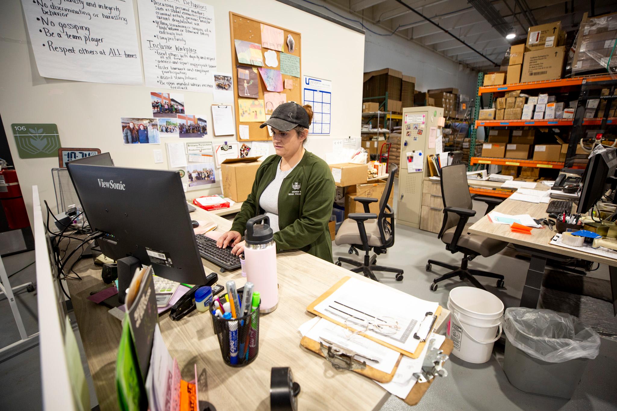 Brittany Persichitte, who graduated from the Women's Bean Project and now works for the nonprofit, stands at her desk in the organization's production facility in Denver's Athmar Park neighborhod. Dec. 23, 2025.