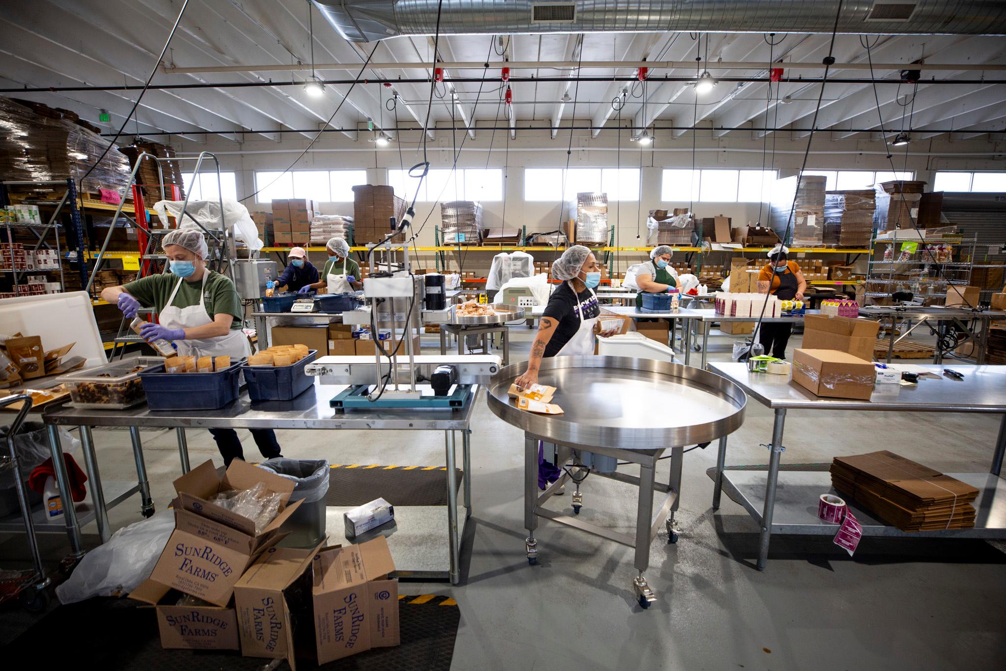 Workers package food at the Women's Bean Project's production facility in Denver's Athmar Park neighborhod. Dec. 23, 2025.