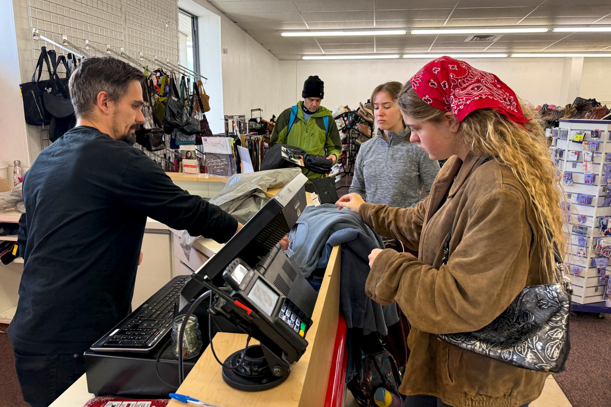 Dombrowsky was flipping through racks of used denim, looking for the perfect pair of jeans — nice color, not too stretchy — to work with. She was looking for fabric to make tote bags and sturdy cloth planters for the school garden.